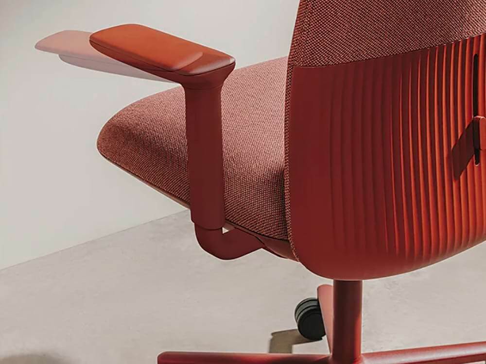 The task armchair includes a technical fabric backrest, upholstered seat, and a Pure Eco thermo-polymer base made from 100% recycled material in black. It can also be customised with an aluminium base in different colours, along with 2D or 4D adjustable armrests for added comfort and support.