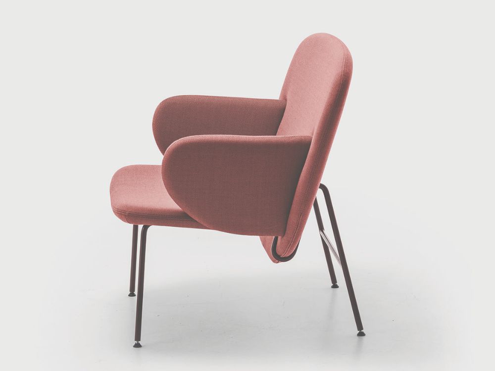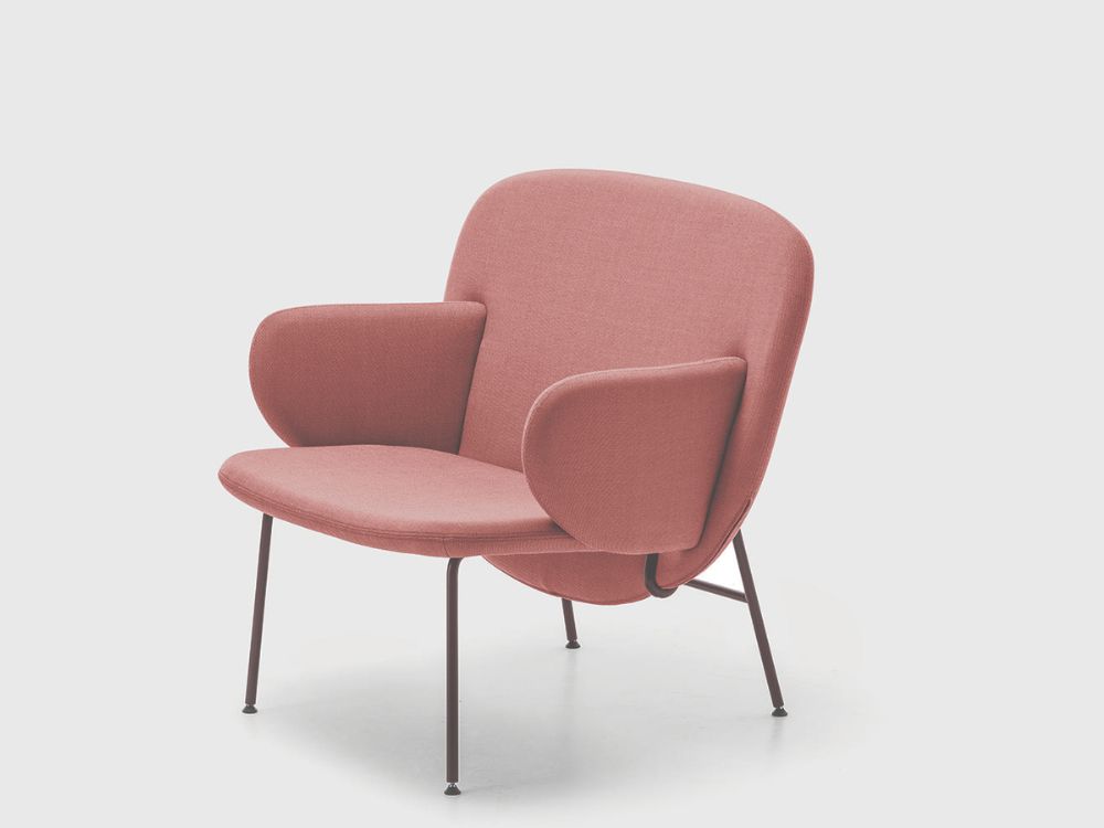 Low chair with arms, shell upholstered in Cat.Super Remix 2 colour 612 (soft pink) on a Black 4-leg metal frame