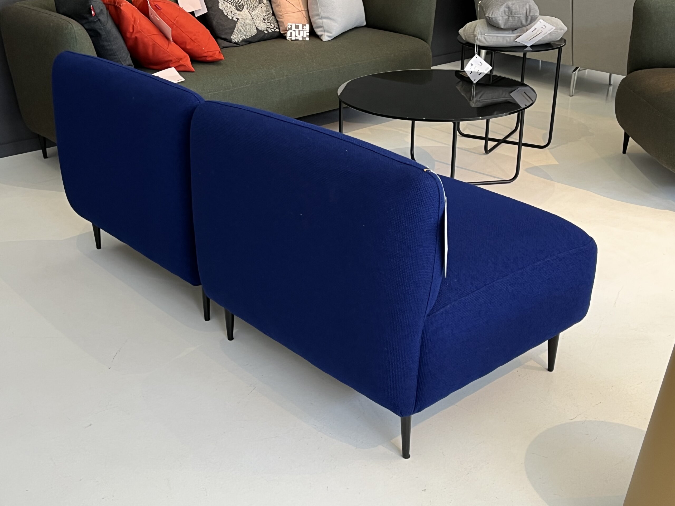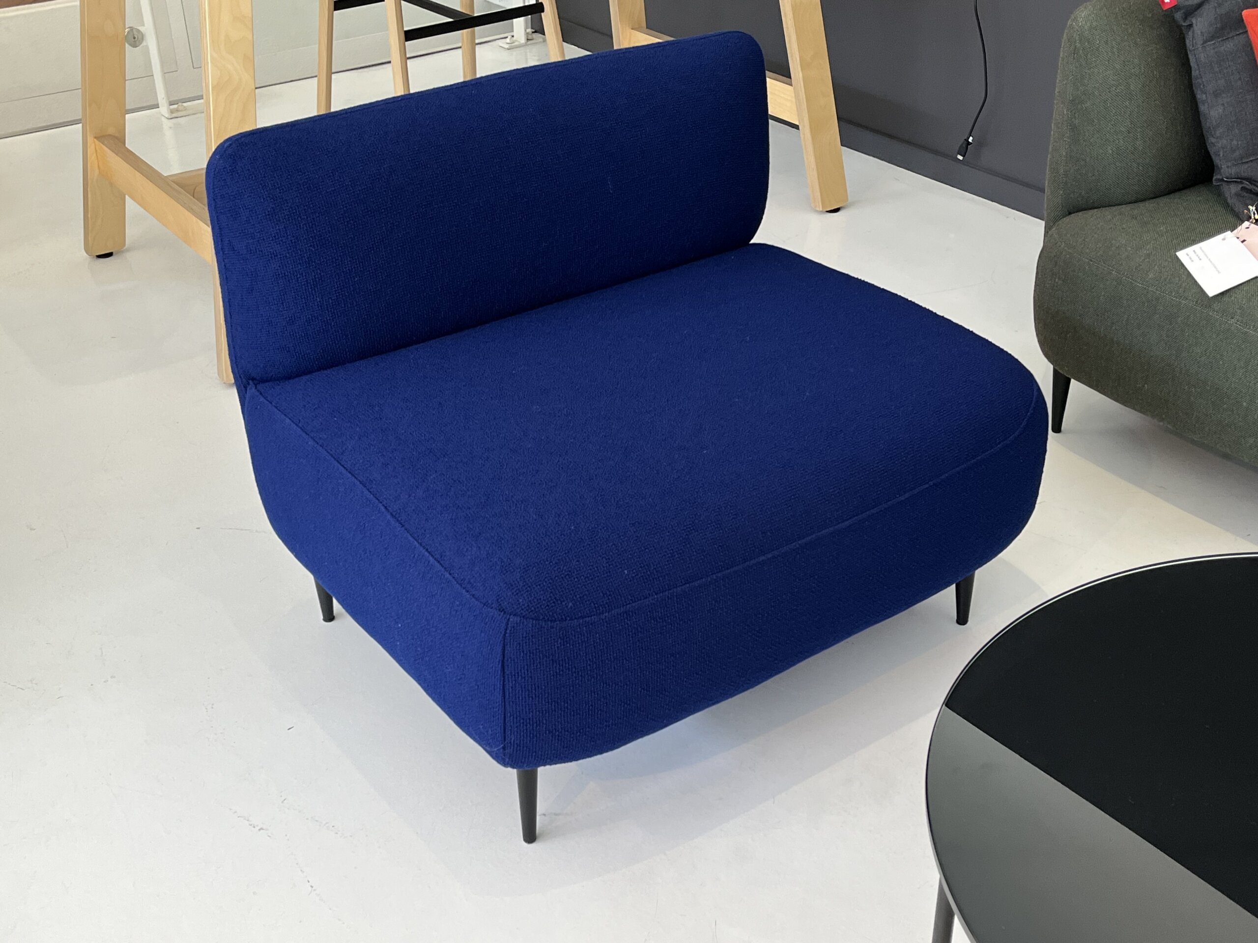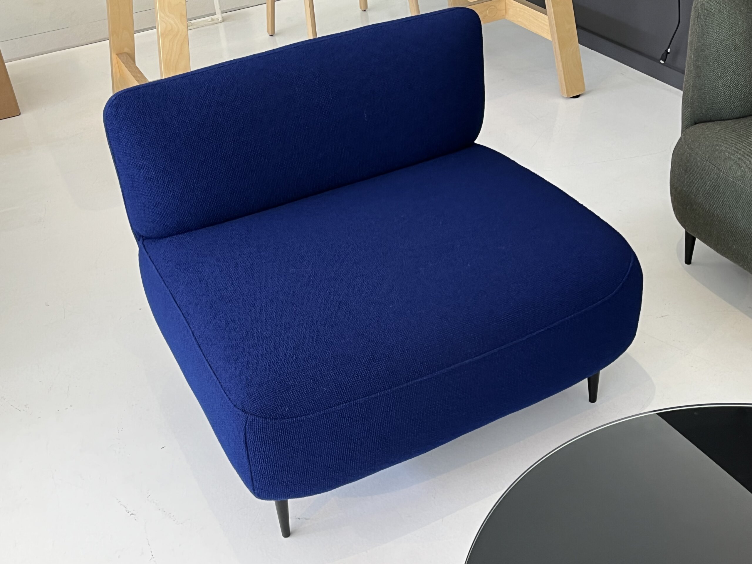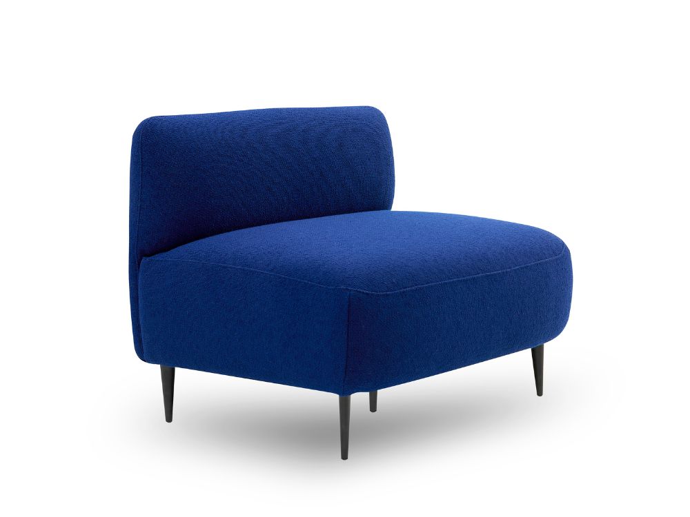 Fully upholstered lounge chair (no arms) in Textilia Yoredale colour Fossdale UDA11 (bright blue) on matt Black 4-leg base