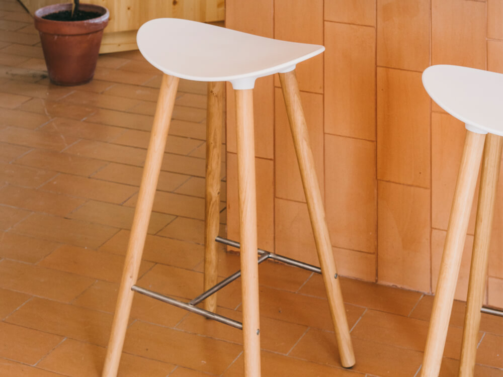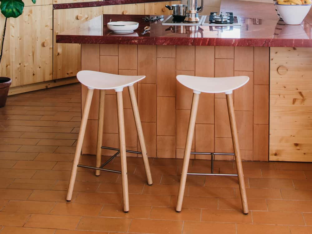 Counter height stool with white polypropylene seat on a natural Oak 4-leg ply base