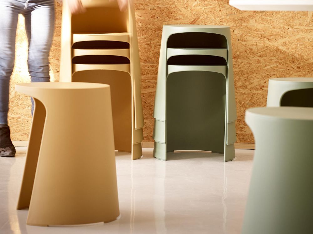 Stools stack 20 high on floor