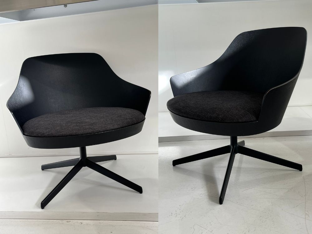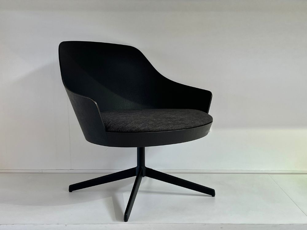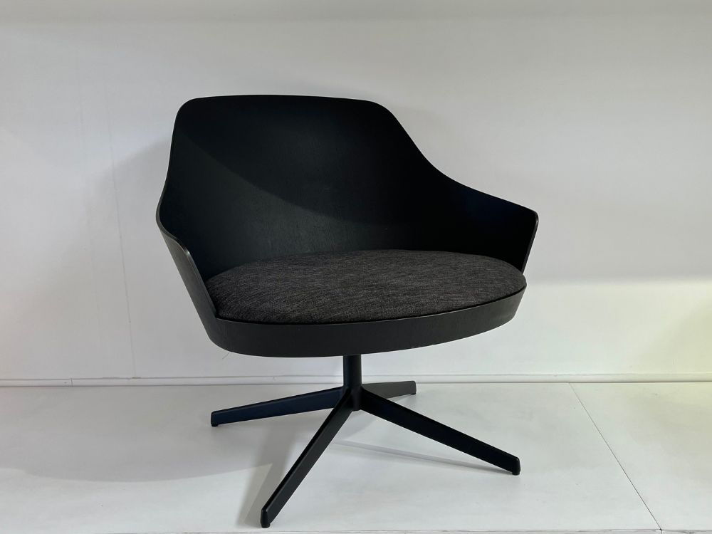 Lounge chair with black stained oak shell with upholstered seat pad on black swivel base