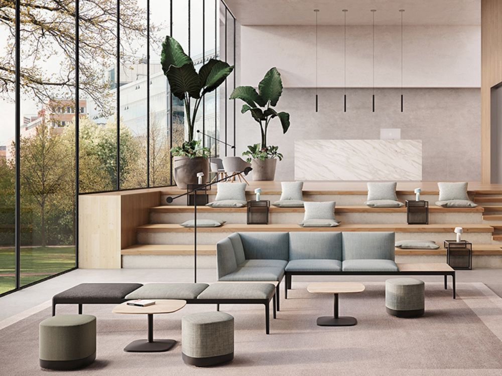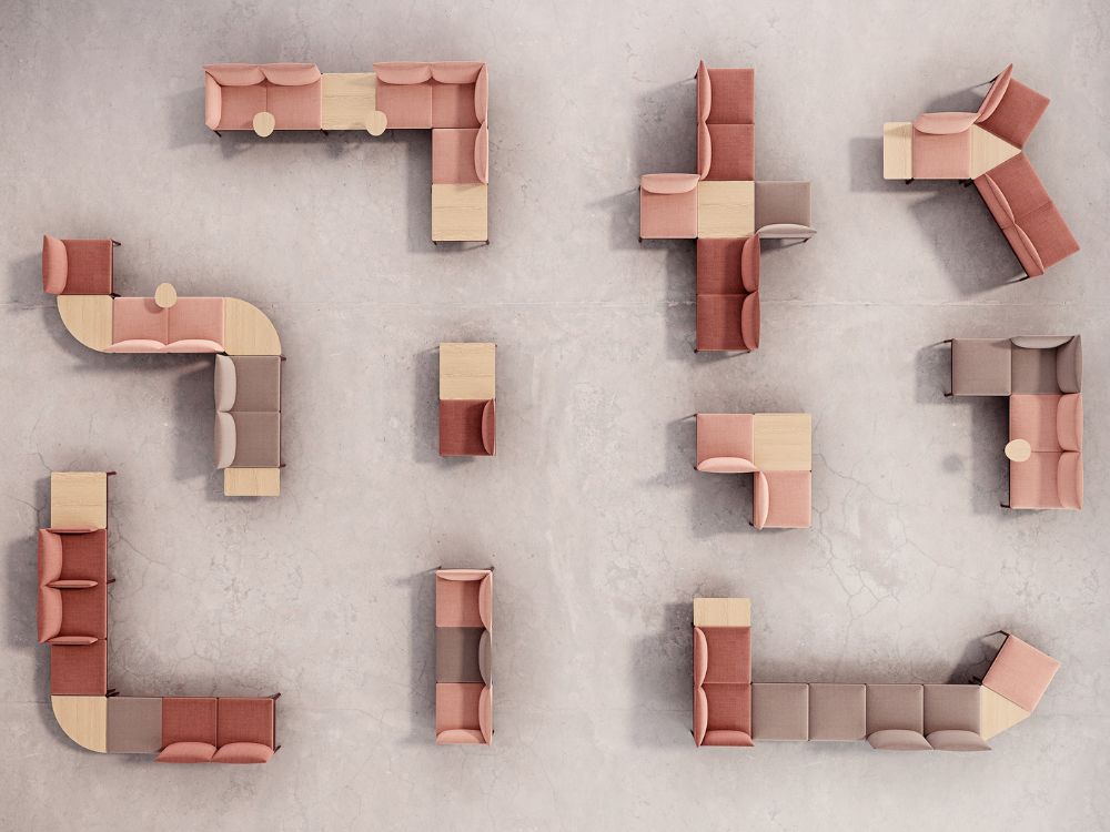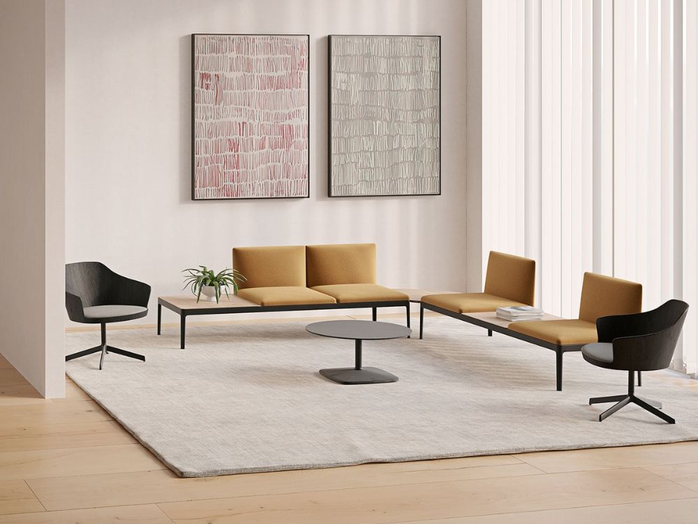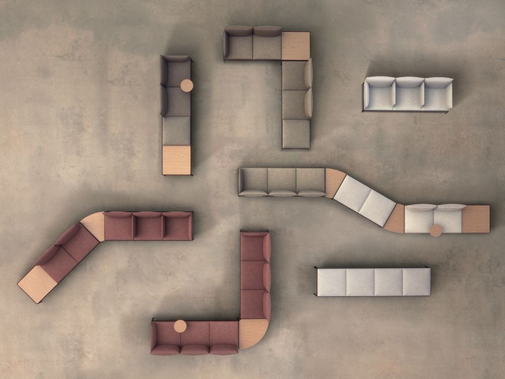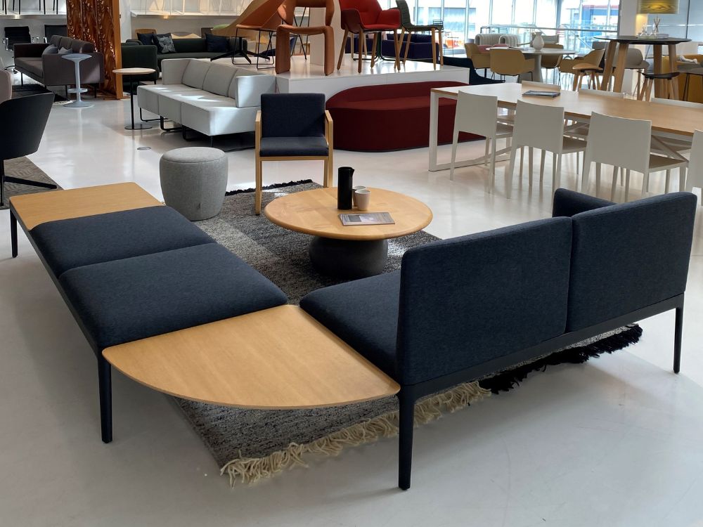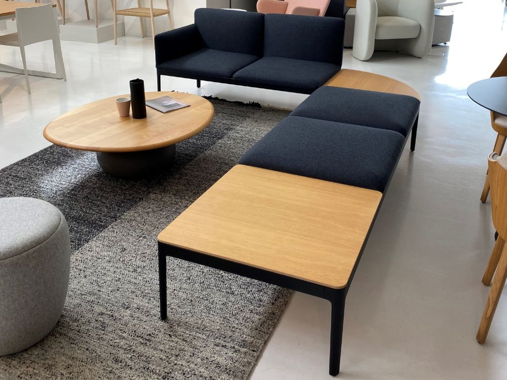 Corner unit joined together via 1 x linking 90 degree Oak table and made up of 1 x 2-place bench with upholstered seats and 1 x 3-place sofa with 2 x upholstered seats and backs , 1x upholstered end arm and 1 x Oak table. All upholstered in Blazer CUZ35 (Charcoal wool fabric) on matt Black n frame and legs