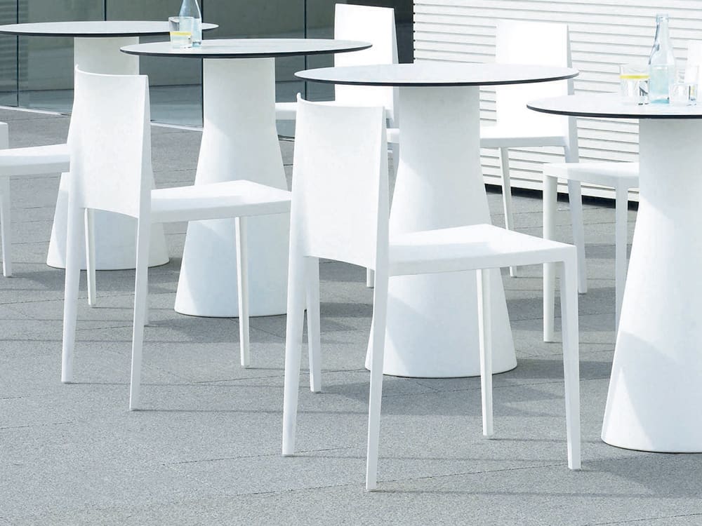 Stackable chair constructed in thermo-polymer available in basalt grey, white, dark grey and sand.