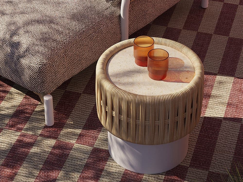 in outdoor environments. Available in round and rectangular shapes and three sizes, they have an aluminum frame in seven colors with corded elements. The weather-resistant polypropylene rope ensures durability. The tables feature surfaces in technical stone, terrazzo marble and compact HPL, offering an aesthetic and functional contrast.